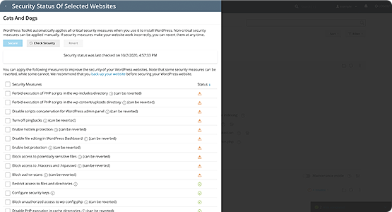A single click of a button will scan and harden your WordPress websites against your selected security risks. You can also password protect specific sites or pages.